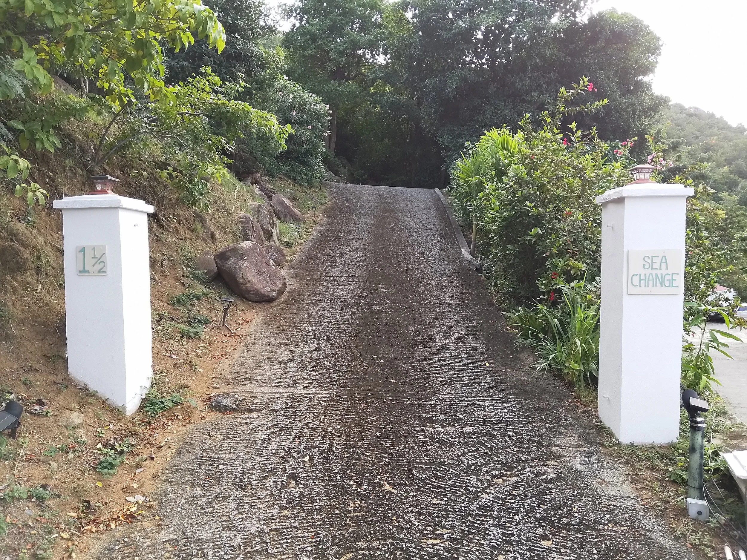By Taxi or by Rental Car, the drive to SeaChange Villa is straightforward. Follow the Coast Road from Ferry Terminals or from the Airport, and identify the primary junction in East End, by the Royal BVI Police Station. Take Greenland Drive to the top of the steep hill. Lambert Estate Road is the second road on the left (pass over the cattle grid), and SeaChange Villa is the second driveway on the left, in Lambert Estate. Look for the columns at the base of the driveway. Wait until you see the view!